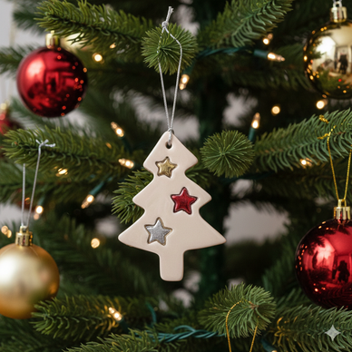 çam ağacı formunda hazırlanmış bu ağaç süsü yaklaşık 10 cm.'dir. yılbaşı temasına uygun renklerde sırlanmış olan ürün kırmızı ile altın ve gümüş yaldızla tamamlanmıştır.