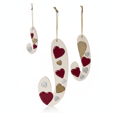 baston şeker formunda hazırlanmış bu duvar süsü seti yaklaşık 25, 20 ve 10 cm.'lik üç parçadan oluşmaktadır. yılbaşı temasına uygun renklerde sırlanmış olan ürünler kırmızı, altın ve gümüş yaldızla tamamlanmıştır.