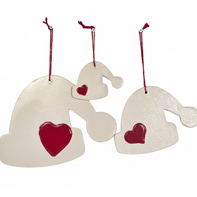 şapka formunda hazırlanmış bu duvar süsü seti yaklaşık 25, 20 ve 10 cm.'lik üç parçadan oluşmaktadır. yılbaşı temasına uygun renklerde sırlanmış olan ürünler kırmızıyla tamamlanmıştır.