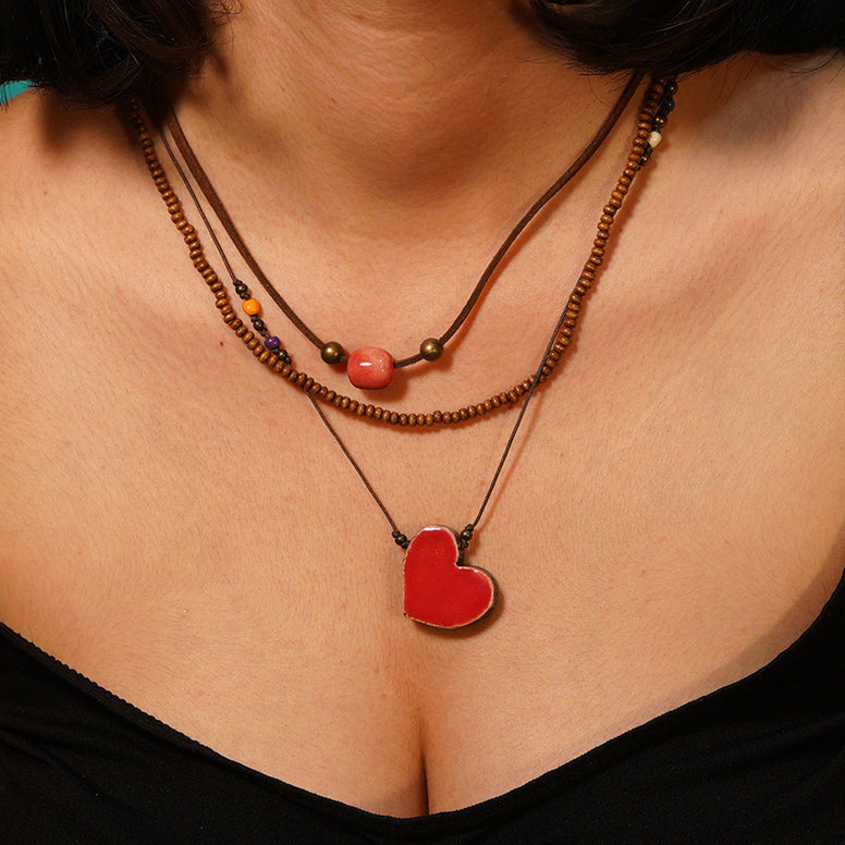 el yapımı, özel tasarım kalp kolye. beyaz çamurdan üretilmiştir. 1040 derecede pişirildikten sonra parlak opak sırla sırlanıp tekrar 1040 derecede pişirilmiştir. yaklaşık 3 cm.'lik seramik kalbin bulunduğu sıra uygun renkte cam ve bronz boncuklarla desteklenmiş, 2 mm. ahşap boncuklu sıranın ardından süet ip ve kalple aynı renkte yine el yapımı seramik boncukla tamamlanmıştır. süet ipten dolayı suyla teması tavsiye edilmez. yüksek derecede fırınlanma işlemi sayesinde seramik parçaların renklerinde ve dokusunda herhangi bir deformasyon yaşanmaz.