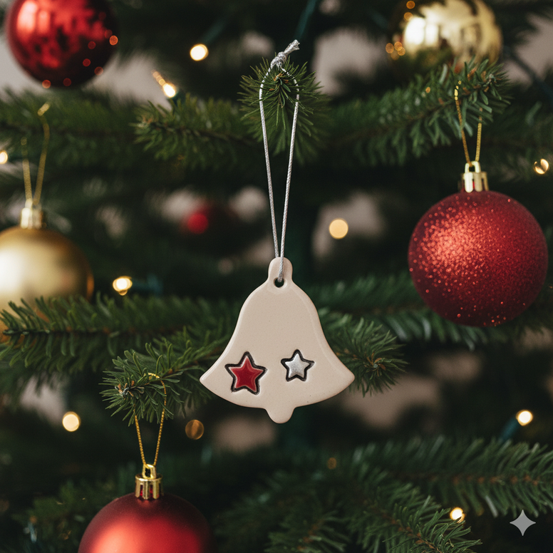 çan formunda hazırlanmış bu ağaç süsü yaklaşık 10 cm.'dir. yılbaşı temasına uygun renklerde sırlanmış olan ürün kırmızı ve gümüş yaldızla tamamlanmıştır.
