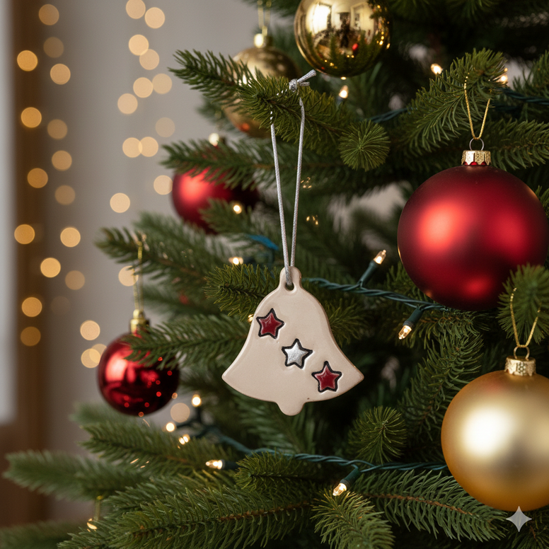 çan formunda hazırlanmış bu ağaç süsü yaklaşık 10 cm.'dir. yılbaşı temasına uygun renklerde sırlanmış olan ürün kırmızı ve gümüş yaldızla tamamlanmıştır.