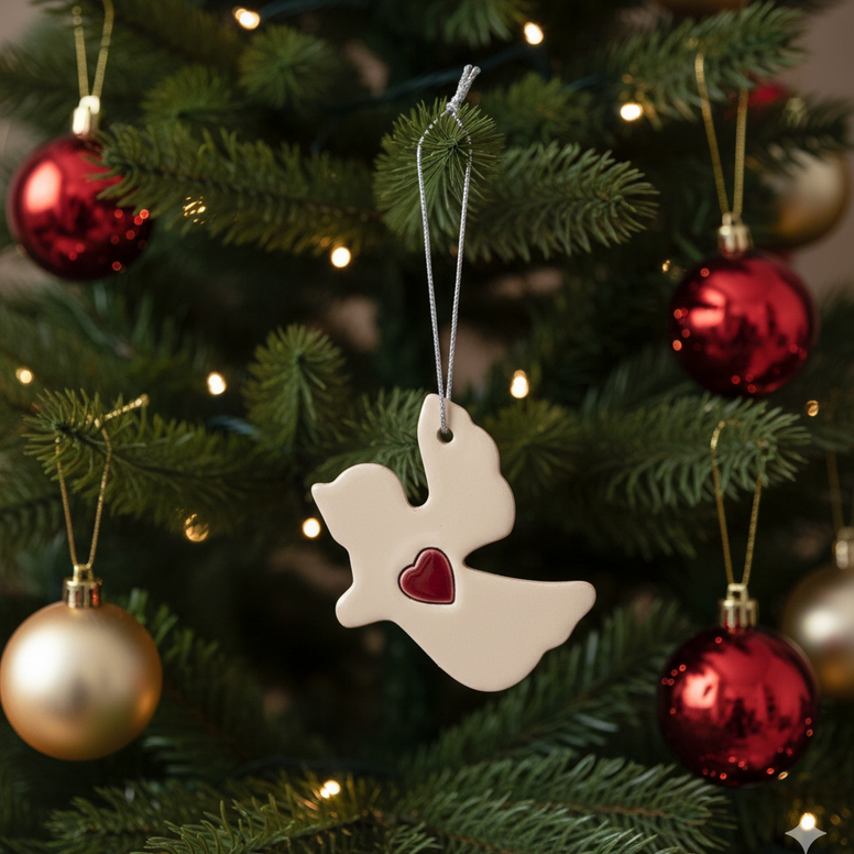 melek formunda hazırlanmış bu ağaç süsü yaklaşık 10 cm.'dir. yılbaşı temasına uygun renklerde sırlanmış olan ürün kırmızı ile tamamlanmıştır.