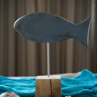 yaklaşık 27 cm.'lik bu balık heykeli seti 10x10x10 cm.'lik ahşap kaidenin üzerinde yer almaktadır.