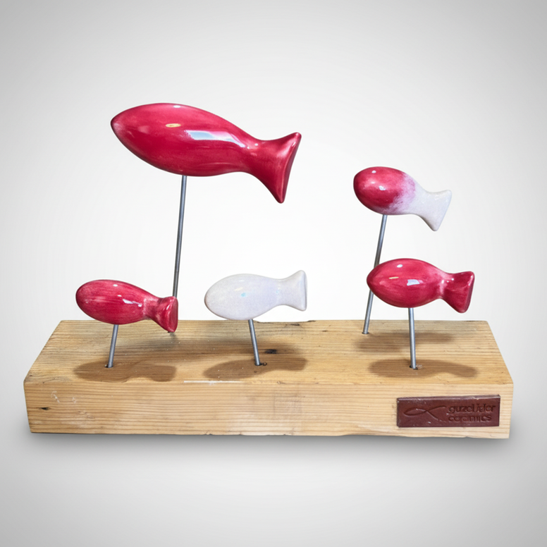 yaklaşık 10 cm.'lik 1 adet, 7,5 cm.'lik 4 balıktan oluşan bu heykel seti 35 cm.'lik ahşap kaidenin üzerinde yer almaktadır.