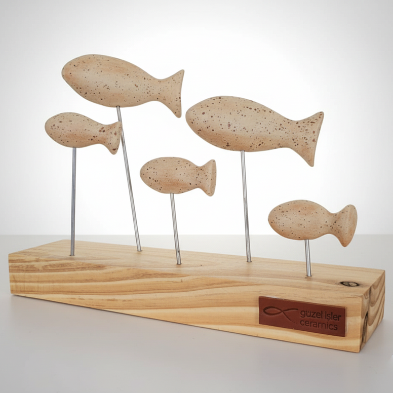 yaklaşık 10 cm.'lik 2 adet, 7,5 cm.'lik 3 balıktan oluşan bu heykel seti 35 cm.'lik ahşap kaidenin üzerinde yer almaktadır.