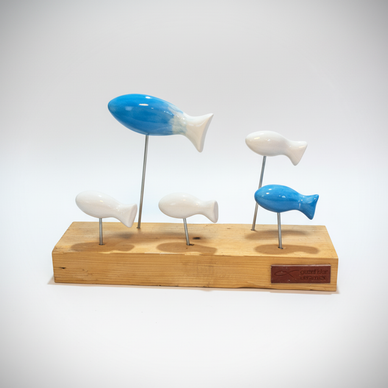 yaklaşık 10 cm.'lik 1 adet, 7,5 cm.'lik 4 balıktan oluşan bu heykel seti 35 cm.'lik ahşap kaidenin üzerinde yer almaktadır.