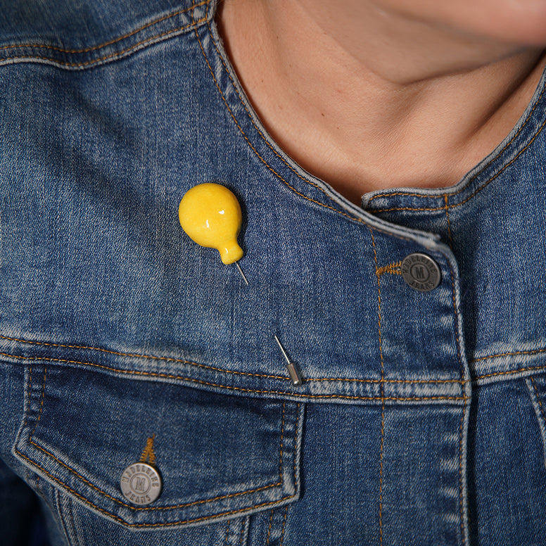 el yapımı, özel tasarım balon broş. beyaz seramik çamuruyla üretilmiştir. 1040 derecede pişirildikten sonra her broş farklı renkte parlak opak sırla sırlanıp tekrar 1040 derecede pişirilmiştir. yüksek derecede fırınlanma işlemi sayesinde renklerde ve dokuda herhangi bir deformasyon yaşanmaz. nikel kaplama broş iğnesinde kararma ve paslanma oluşmaz.
