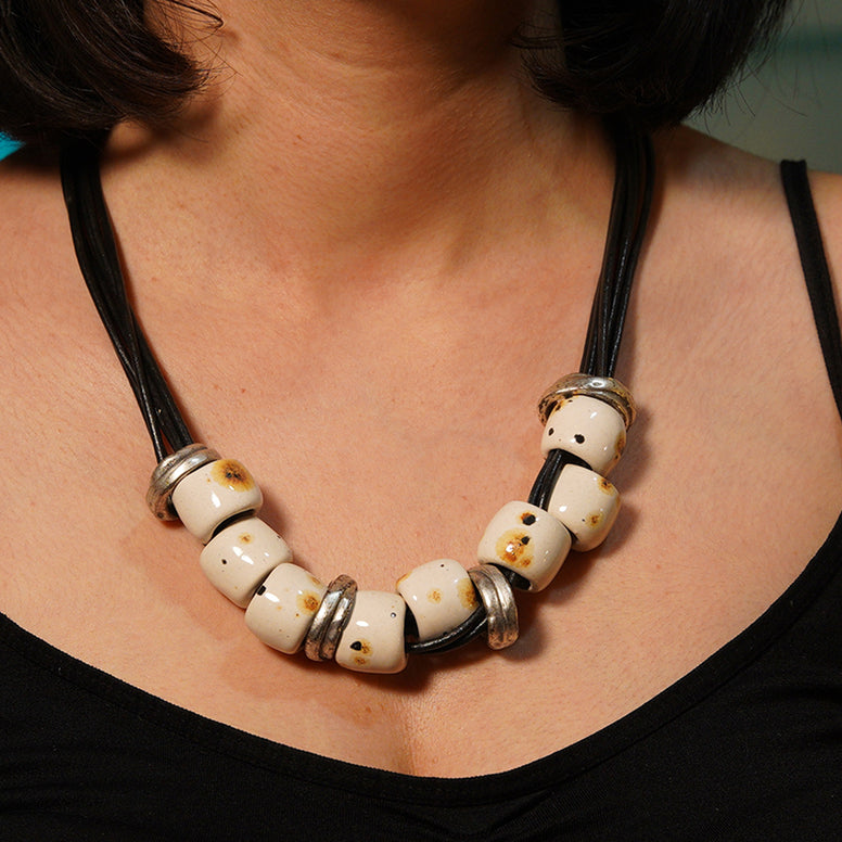 yaklaşık 1 cm çapında ve 1 cm kalınlığında el yapımı seramik boncuklardan oluşan bu kolye gümüş kaplama metal halkalar eklenerek oluşturulmuştur. kullanılan efektli sır her bir boncuğa farklı bir görünüm vermektedir.