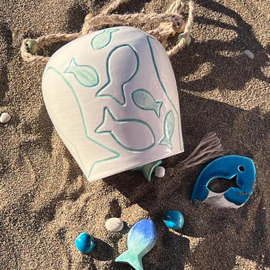 ilhamını doğadan alan balık desenli çanlar, evinize ege'nin esintilerini taşımaktadır. seramik çamurunun üzerine kazınarak işlenen balık desenleri sıraltı boyalarla renklendirildikten sonra transparan sırlanmıştır.