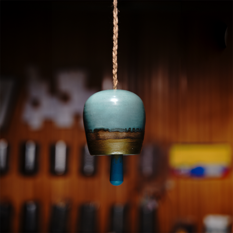 tornada şekillendirilen çan, turkuvaz sırla sırlanmıştır. İki renk arasına uygulanan altın yaldızla, renklerin rutini bozularak daha çarpıcı bir geçiş elde edilmesi amaçlanmıştır.
