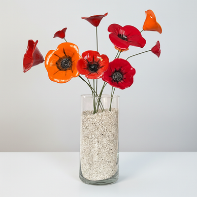3 boyutlu tasarlanmış seramik gelincikler üç farklı boyda üretilmiştir. tüm yüzeyleri sırlı olan çiçekler bükülebilir tellerle desteklenmektedir. kırmızı, alev kırmızı ve turuncu gelincik demetlerinden oluşan bu set toplamda 9 adet çiçek içermektedir. 15 cm çapında, 30 cm. yükseklikteki silindir cam vazo ile çiçeklerin ağırlığını dengelemek amacıyla vazonun 3/2’sini dolduracak kadar çiçek taşı ile birlikte gönderilmektedir.