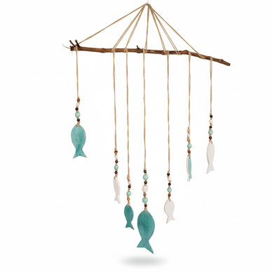 bir büyük, iki orta, dört küçük olmak üzere yedi balıktan oluşan bu duvar süsü, iki farklı renkte (turkuvaz-beyaz) sırlanmıştır. aynı renklerde sırlanmış seramik ve doğal ahşap boncuklarla dekore edilmiştir.