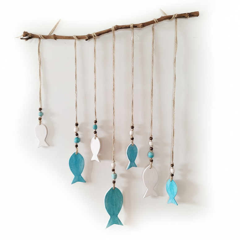 bir büyük, iki orta, dört küçük olmak üzere yedi balıktan oluşan bu duvar süsü, iki farklı renkte (turkuvaz-beyaz) sırlanmıştır. aynı renklerde sırlanmış seramik ve doğal ahşap boncuklarla dekore edilmiştir.