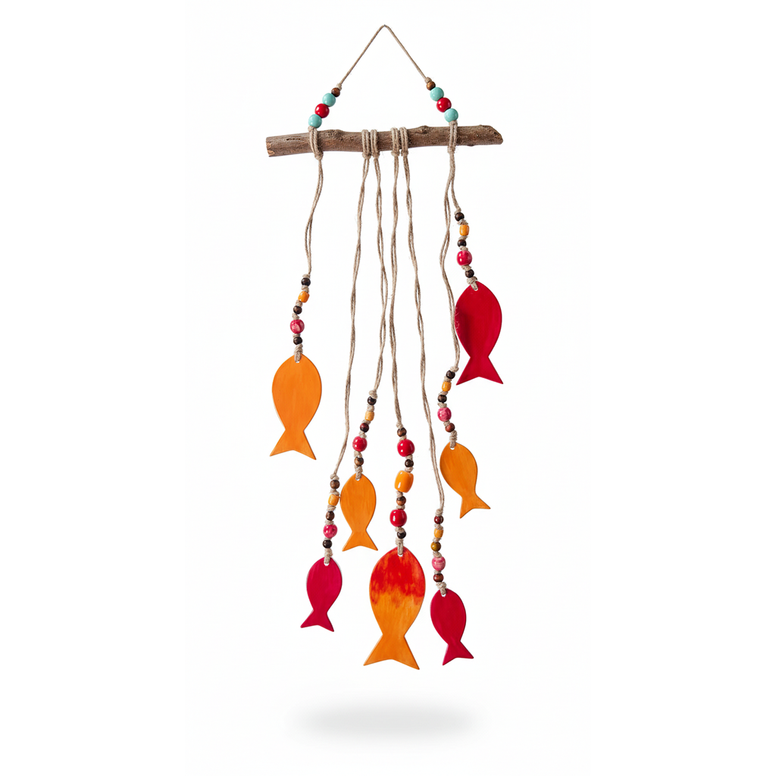 bir büyük, iki orta, dört küçük olmak üzere yedi balıktan oluşan bu duvar süsü, iki farklı renkte sırlanmıştır. Aynı renklerde sırlanmış seramik ve doğal ahşap boncuklarla dekore edilmiştir.