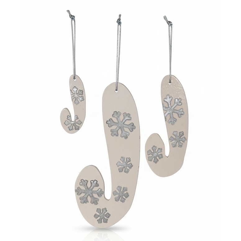 baston şeker formunda hazırlanmış bu duvar süsü seti yaklaşık 25, 20 ve 10 cm.'lik üç parçadan oluşmaktadır. yılbaşı temasına uygun renklerde sırlanmış olan ürünler gümüş yaldızla tamamlanmıştır.