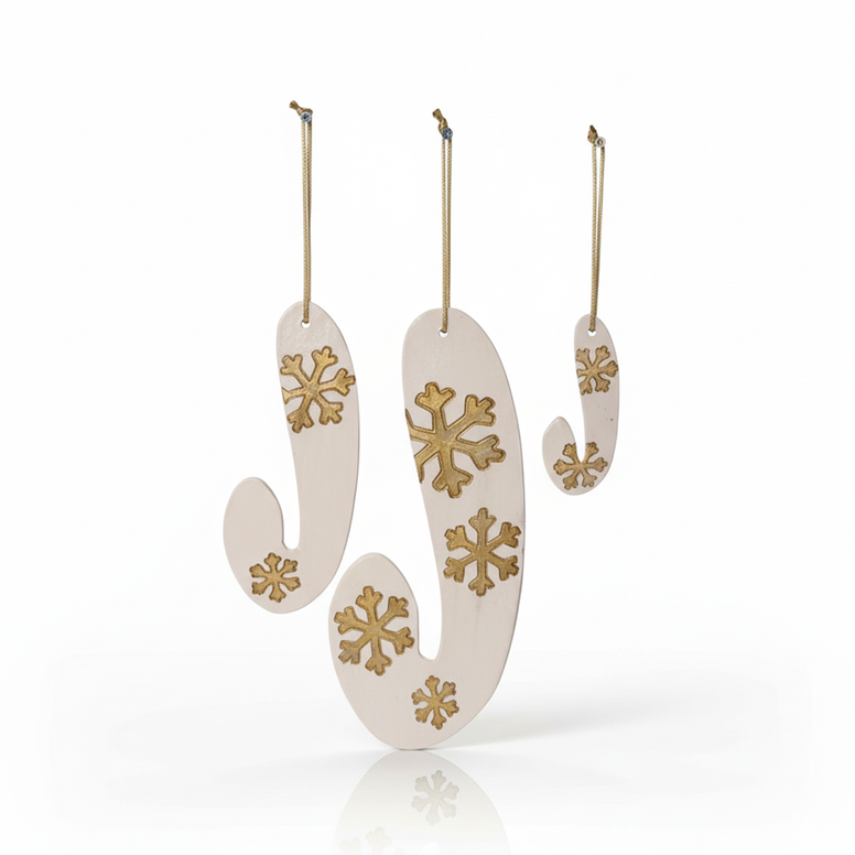 baston şeker formunda hazırlanmış bu duvar süsü seti yaklaşık 25, 20 ve 10 cm.'lik üç parçadan oluşmaktadır. yılbaşı temasına uygun renklerde sırlanmış olan ürünler altın yaldızla tamamlanmıştır.