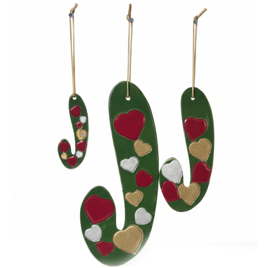 baston şeker formunda hazırlanmış bu duvar süsü seti yaklaşık 25, 20 ve 10 cm.'lik üç parçadan oluşmaktadır. yılbaşı temasına uygun renklerde sırlanmış olan ürünler kırmızı, altın ve gümüş yaldızla tamamlanmıştır.