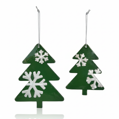 çam ağacı formunda hazırlanmış bu duvar süsü seti yaklaşık 25 ve 20 cm.'lik iki parçadan oluşmaktadır. yılbaşı temasına uygun renklerde sırlanmış olan ürünler gümüş yaldızla tamamlanmıştır.