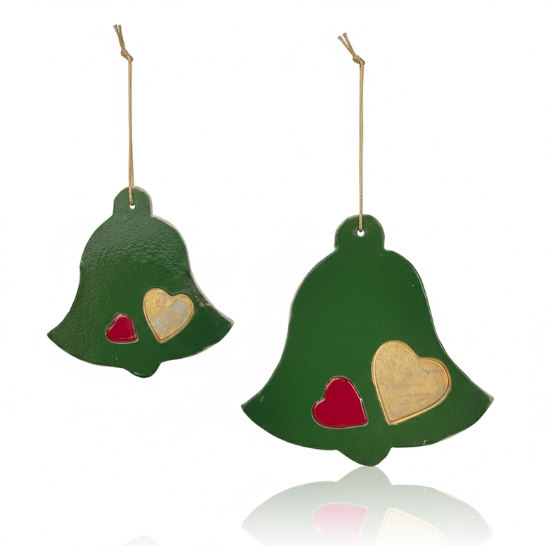 çan formunda hazırlanmış bu duvar süsü seti yaklaşık 25 ve 20 cm.'lik iki parçadan oluşmaktadır. yılbaşı temasına uygun renklerde sırlanmış olan ürünler kırmızı ve altın yaldızla tamamlanmıştır.