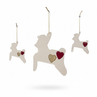 geyik formunda hazırlanmış bu duvar süsü seti yaklaşık 25, 20 ve 10 cm.'lik üç parçadan oluşmaktadır. yılbaşı temasına uygun renklerde sırlanmış olan ürünler kırmızı ve altın  yaldızla tamamlanmıştır.