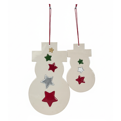 kardan adam formunda hazırlanmış bu duvar süsü seti yaklaşık 25 ve  20 cm.'lik iki parçadan oluşmaktadır. yılbaşı temasına uygun renklerde sırlanmış olan ürünler kırmızı, yeşil, altın ve gümüş yaldızla tamamlanmıştır.