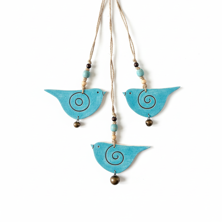 üç farklı boyda kuş figüründen oluşan bu duvar süsünde her kuşun boyutuyla uyumlu bakır çıngırak kullanılmıştır. seramik ve ahşap boncuklarla süslenen kuşlar ayrı ayrı duvara monte edilerek kullanılabilir. jüt iplerin uzunluğu istenildiği gibi ayarlanmak üzere uzun hazırlanmıştır.