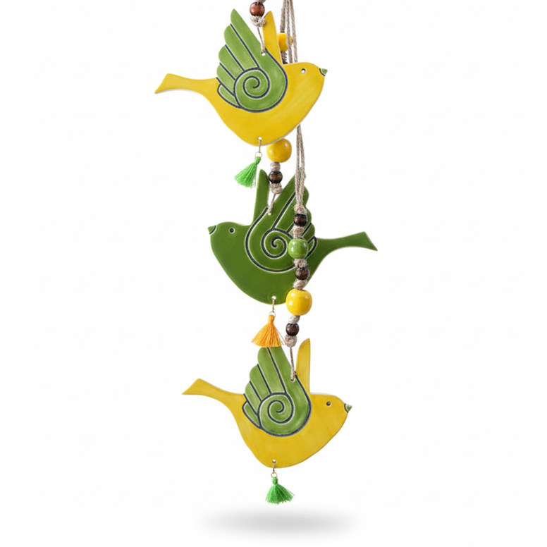üç farklı boyda kuş figüründen oluşan bu duvar süsünde her kuşun boyutuyla uyumlu püskül kullanılmıştır. seramik ve ahşap boncuklarla süslenen kuşlar ayrı ayrı duvara monte edilerek kullanılabilir. jüt iplerin uzunluğu istenildiği gibi ayarlanmak üzere uzun hazırlanmıştır.