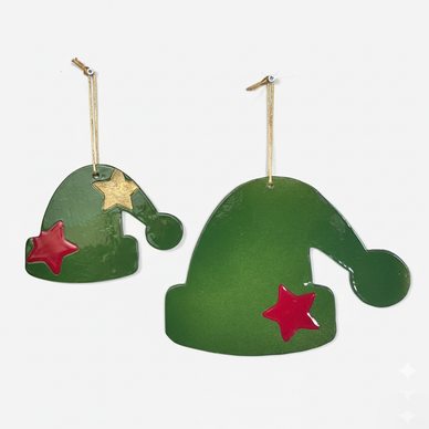 şapka formunda hazırlanmış bu duvar süsü seti yaklaşık 25 ve 20 cm.'lik iki parçadan oluşmaktadır. yılbaşı temasına uygun renklerde sırlanmış olan ürünler kırmızı ve altın yaldızla tamamlanmıştır.