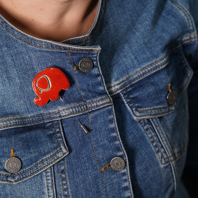 el yapımı, özel tasarım fil broş. beyaz seramik çamuruyla üretilmiştir. 1040 derecede pişirildikten sonra çizgisel detaylar siyah sıraltı boya ile netleştirilmiş ve her broş farklı renkte parlak opak sırla sırlanıp tekrar 1040 derecede pişirilmiştir. yüksek derecede fırınlanma işlemi sayesinde renklerde ve dokuda herhangi bir deformasyon yaşanmaz. nikel kaplama broş iğnesinde kararma ve paslanma oluşmaz.