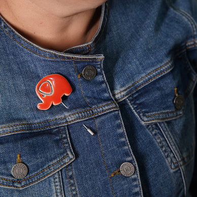 el yapımı, özel tasarım fil broş. beyaz seramik çamuruyla üretilmiştir. 1040 derecede pişirildikten sonra çizgisel detaylar siyah sıraltı boya ile netleştirilmiş ve her broş farklı renkte parlak opak sırla sırlanıp tekrar 1040 derecede pişirilmiştir. yüksek derecede fırınlanma işlemi sayesinde renklerde ve dokuda herhangi bir deformasyon yaşanmaz. nikel kaplama broş iğnesinde kararma ve paslanma oluşmaz.