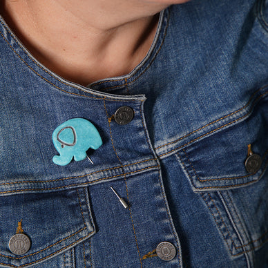 el yapımı, özel tasarım fil broş. beyaz seramik çamuruyla üretilmiştir. 1040 derecede pişirildikten sonra çizgisel detaylar siyah sıraltı boya ile netleştirilmiş ve her broş farklı renkte parlak opak sırla sırlanıp tekrar 1040 derecede pişirilmiştir. yüksek derecede fırınlanma işlemi sayesinde renklerde ve dokuda herhangi bir deformasyon yaşanmaz. nikel kaplama broş iğnesinde kararma ve paslanma oluşmaz.