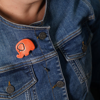 el yapımı, özel tasarım fil broş. beyaz seramik çamuruyla üretilmiştir. 1040 derecede pişirildikten sonra çizgisel detaylar siyah sıraltı boya ile netleştirilmiş ve her broş farklı renkte parlak opak sırla sırlanıp tekrar 1040 derecede pişirilmiştir. yüksek derecede fırınlanma işlemi sayesinde renklerde ve dokuda herhangi bir deformasyon yaşanmaz. nikel kaplama broş iğnesinde kararma ve paslanma oluşmaz.
