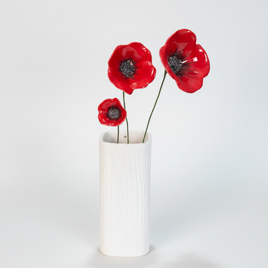 3 boyutlu tasarlanmış seramik gelincikler üç farklı boyda üretilmiştir. tüm yüzeyleri sırlı olan çiçekler bükülebilir tellerle desteklenmektedir.