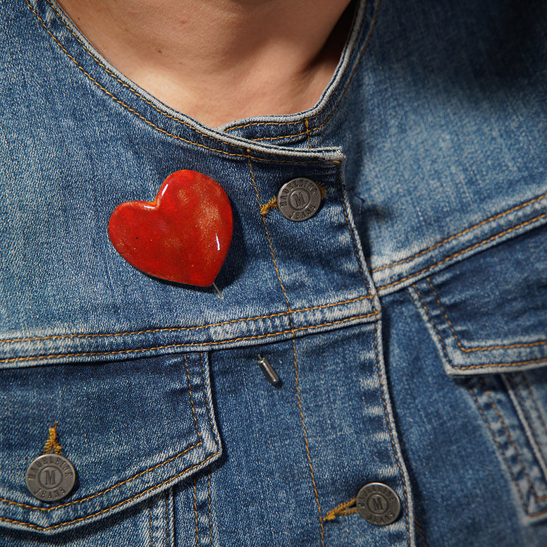 el yapımı, özel tasarım kalp broş. beyaz seramik çamuruyla üretilmiştir. 1040 derecede pişirildikten sonra her broş farklı renkte parlak opak sırla sırlanıp tekrar 1040 derecede pişirilmiştir. yüksek derecede fırınlanma işlemi sayesinde renklerde ve dokuda herhangi bir deformasyon yaşanmaz. nikel kaplama broş iğnesinde kararma ve paslanma oluşmaz.