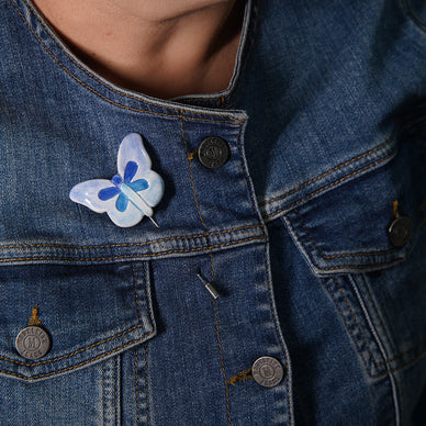 el yapımı, özel tasarım kelebek broş. beyaz seramik çamuruyla üretilmiştir. 1040 derecede pişirildikten sonra her broş farklı renkte parlak opak sırla sırlanıp tekrar 1040 derecede pişirilmiştir. yüksek derecede fırınlanma işlemi sayesinde renklerde ve dokuda herhangi bir deformasyon yaşanmaz. nikel kaplama broş iğnesinde kararma ve paslanma oluşmaz.