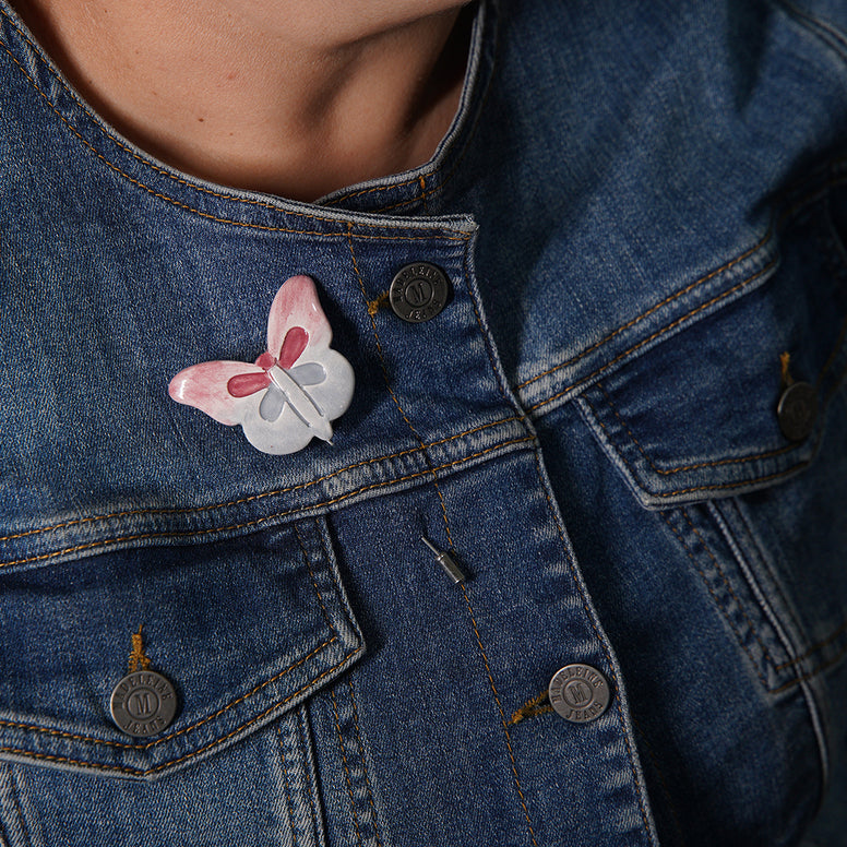 el yapımı, özel tasarım kelebek broş. beyaz seramik çamuruyla üretilmiştir. 1040 derecede pişirildikten sonra her broş farklı renkte parlak opak sırla sırlanıp tekrar 1040 derecede pişirilmiştir. yüksek derecede fırınlanma işlemi sayesinde renklerde ve dokuda herhangi bir deformasyon yaşanmaz. nikel kaplama broş iğnesinde kararma ve paslanma oluşmaz.