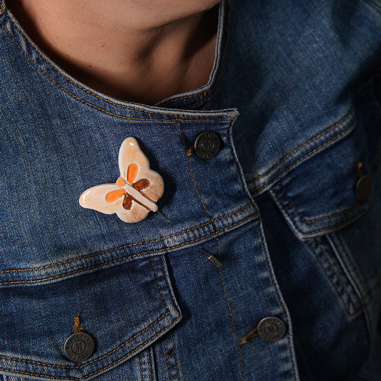 el yapımı, özel tasarım kelebek broş. beyaz seramik çamuruyla üretilmiştir. 1040 derecede pişirildikten sonra her broş farklı renkte parlak opak sırla sırlanıp tekrar 1040 derecede pişirilmiştir. yüksek derecede fırınlanma işlemi sayesinde renklerde ve dokuda herhangi bir deformasyon yaşanmaz. nikel kaplama broş iğnesinde kararma ve paslanma oluşmaz.
