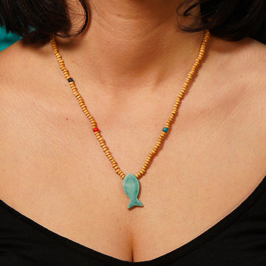 el yapımı, özel tasarım balık kolye. beyaz çamurdan üretilmiştir. 1040 derecede pişirildikten sonra parlak opak sırla sırlanıp tekrar 1040 derecede pişirilmiştir. Yaklaşık 3 cm. seramik balığın bulunduğu sıra uygun renkte cam ve bronz boncuklarla desteklenmiştir. Yüksek derecede fırınlanma işlemi sayesinde seramik parçaların renklerinde ve dokusunda herhangi bir deformasyon yaşanmaz.