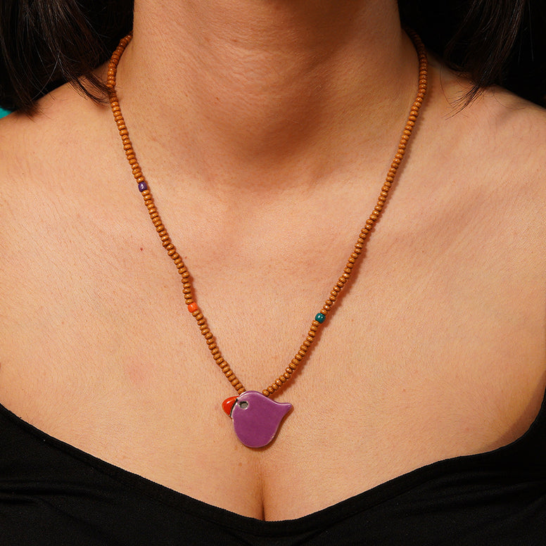 el yapımı, özel tasarım kuş kolye. beyaz çamurdan üretilmiştir. 1040 derecede pişirildikten sonra parlak opak sırla sırlanıp tekrar 1040 derecede pişirilmiştir. yaklaşık 3 cm. seramik kuşun bulunduğu sıra uygun renkte cam ve bronz boncuklarla desteklenmiştir. yüksek derecede fırınlanma işlemi sayesinde seramik parçaların renklerinde ve dokusunda herhangi bir deformasyon yaşanmaz.