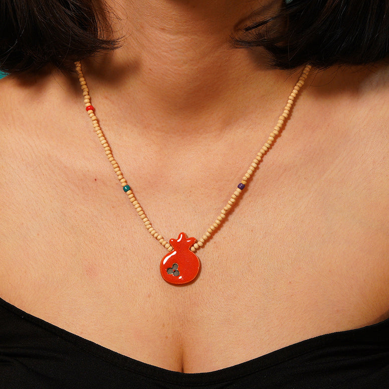 el yapımı, özel tasarım nar kolye. beyaz çamurdan üretilmiştir. 1040 derecede pişirildikten sonra parlak opak sırla sırlanıp tekrar 1040 derecede pişirilmiştir. yaklaşık 3 cm. seramik narın bulunduğu sıra uygun renkte cam ve bronz boncuklarla desteklenmiştir. yüksek derecede fırınlanma işlemi sayesinde seramik parçaların renklerinde ve dokusunda herhangi bir deformasyon yaşanmaz.