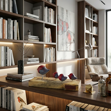 yaklaşık 10x8 cm.'lik bir adet ve 5x4 cm.'lik üç adet kuştan oluşan bu heykel seti 30 cm.'lik ahşap kaidenin üzerinde yer almaktadır.