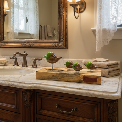 yaklaşık 10x8 cm.'lik bir adet ve 5x4 cm.'lik üç adet kuştan oluşan bu heykel seti 30 cm.'lik ahşap kaidenin üzerinde yer almaktadır.