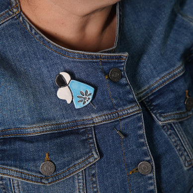 el yapımı, özel tasarım melek broş. beyaz seramik çamuruyla üretilmiştir. 1040 derecede pişirildikten sonra çizgisel detaylar siyah sıraltı boya ile netleştirilmiş ve her broş farklı renkte parlak opak sırla sırlanıp tekrar 1040 derecede pişirilmiştir. yüksek derecede fırınlanma işlemi sayesinde renklerde ve dokuda herhangi bir deformasyon yaşanmaz. nikel kaplama broş iğnesinde kararma ve paslanma oluşmaz.