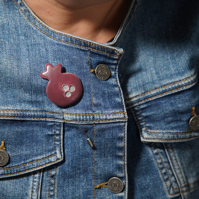 el yapımı, özel tasarım nar broş. beyaz seramik çamuruyla üretilmiştir. 1040 derecede pişirildikten sonra çizgisel detaylar siyah sıraltı boya ile netleştirilmiş ve her broş farklı renkte parlak opak sırla sırlanıp tekrar 1040 derecede pişirilmiştir. yüksek derecede fırınlanma işlemi sayesinde renklerde ve dokuda herhangi bir deformasyon yaşanmaz. nikel kaplama broş iğnesinde kararma ve paslanma oluşmaz.