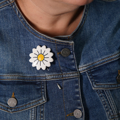 el yapımı, özel tasarım papatya broş. beyaz seramik çamuruyla üretilmiştir. 1040 derecede pişirildikten sonra çizgisel detaylar siyah sıraltı boya ile netleştirilmiş ve her broş farklı renkte parlak opak sırla sırlanıp tekrar 1040 derecede pişirilmiştir. yüksek derecede fırınlanma işlemi sayesinde renklerde ve dokuda herhangi bir deformasyon yaşanmaz. nikel kaplama broş iğnesinde kararma ve paslanma oluşmaz.